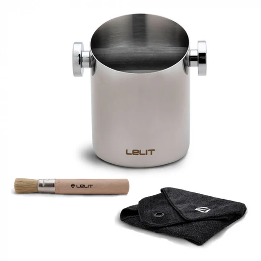 Keep your espresso station clean and stylish with the Lelit Knock Box. Made from brushed stainless steel with an anti-slip base and rubber-coated knock-bar, it holds up to 10 spent coffee pucks and includes a microfiber cloth and wooden brush for easy maintenance.